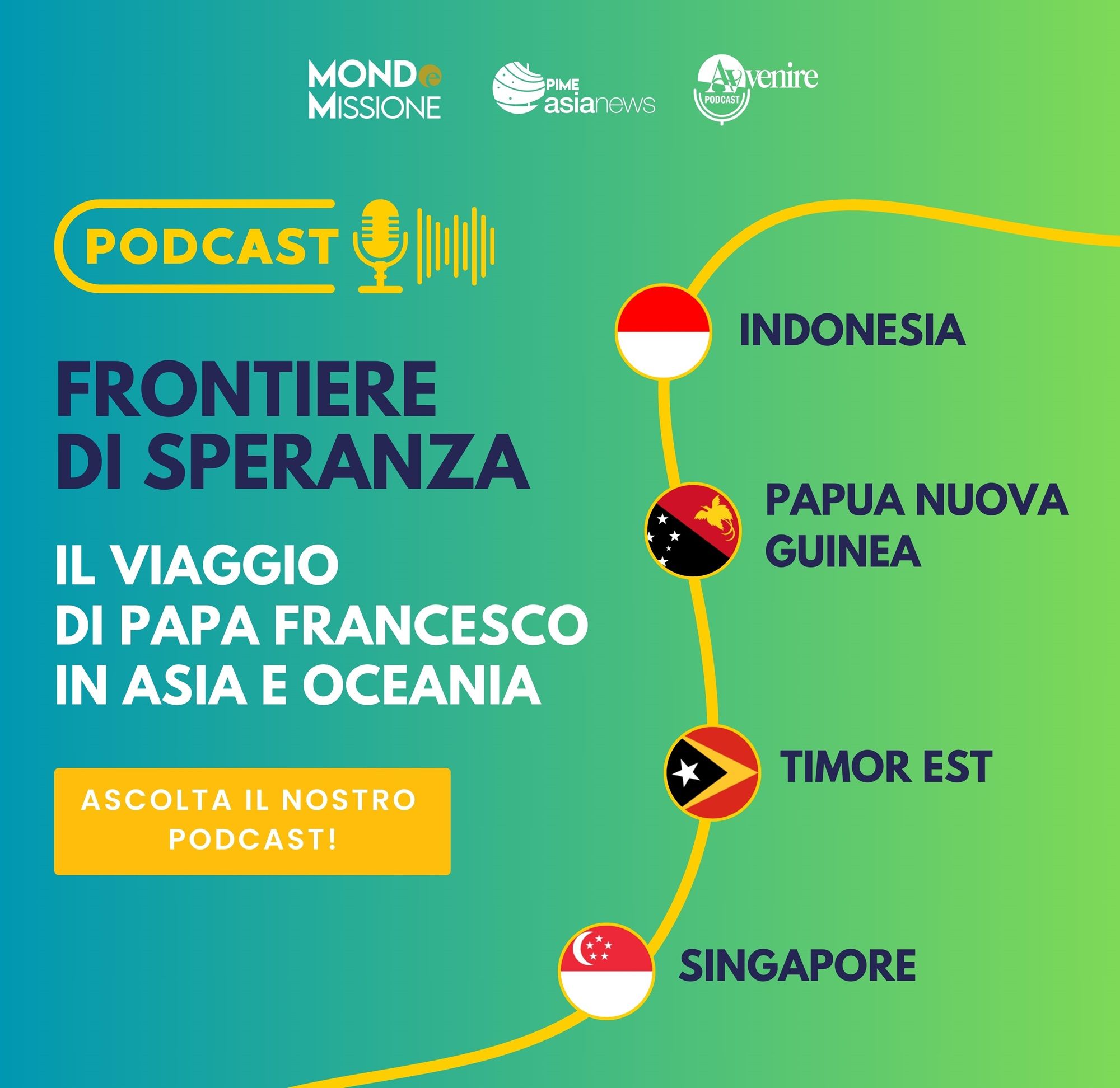 “Frontiere di speranza” è un podcast realizzato dall’agenzia AsiaNews e dalla rivista Mondo e Missione, in collaborazione con Avvenire, per raccontare il viaggio di Papa Francesco in Indonesia, Papua Nuova Guinea, Timor Est e Singapore dal 2 al 13 settembre 2024. Ha collaborato al montaggio Filippo Carpani.Articoli correlati