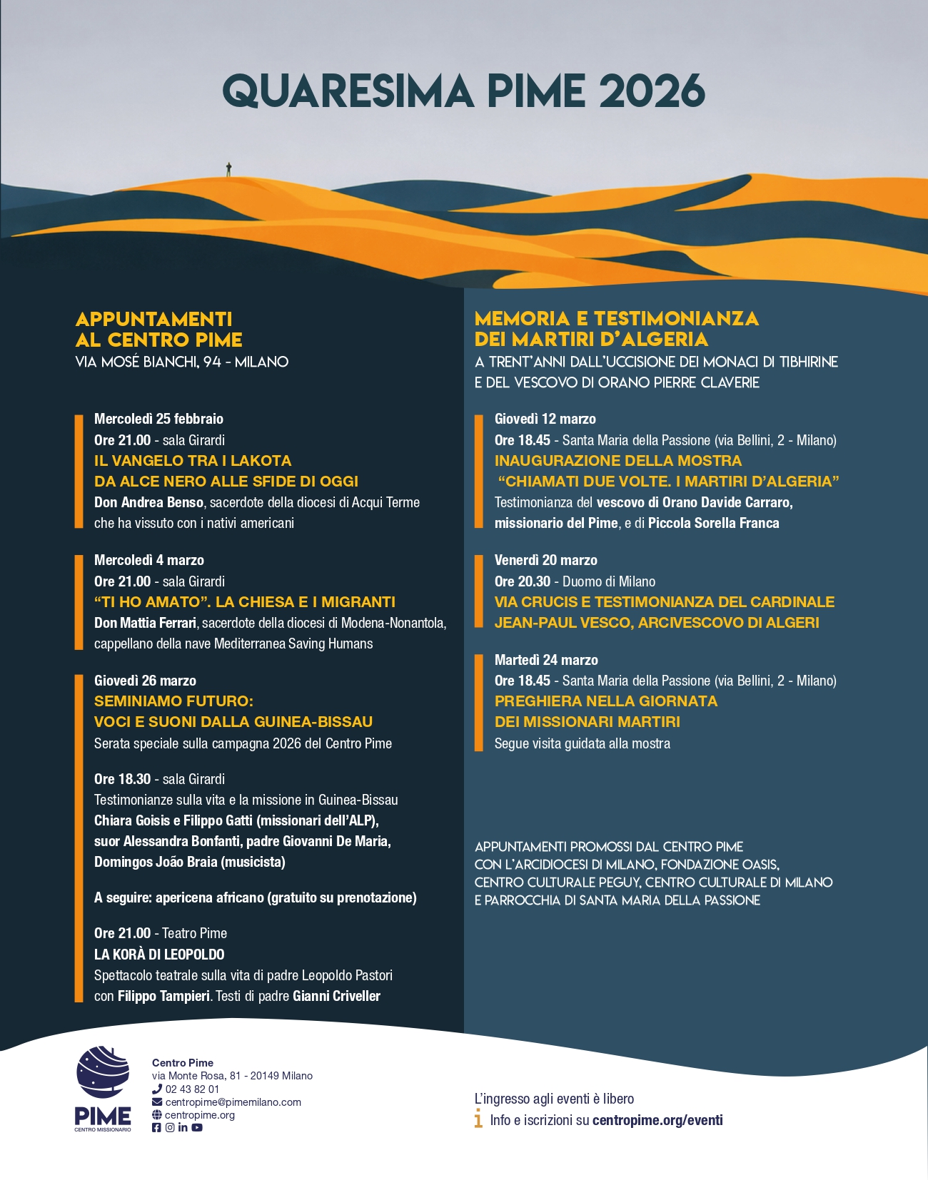 Inoltre, in occasione del trentennale dell’uccisione dei monaci di Tibhirine e del vescovo di Orano Pierre Claverie, il Centro Pime promuove – insieme a arcidiocesi di Milano, Fondazione Internazionale Oasis, Centro culturale Péguy, Centro culturale di Milano e parrocchia di Santa Maria della Passione – alcuni momenti di memoria e testimonianza.